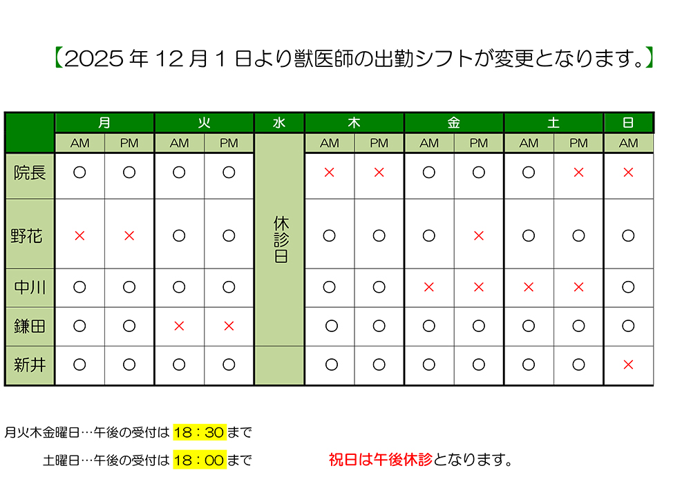 各獣医師の出勤状況は以下の通りとなります。