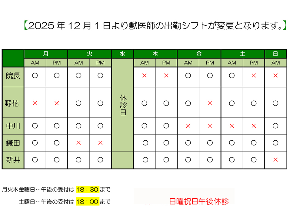 各獣医師の出勤状況は以下の通りとなります。